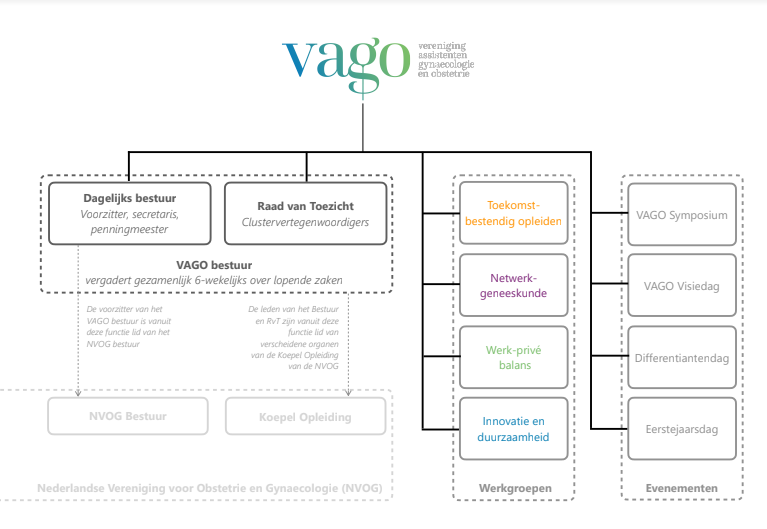 De VAGO heeft 4 werkgroepen, die we inzetten om onze visie uit te werken. AIOS nemen plaats in deze werkgroepen, ondersteund door 1 of 2 VAGO bestuursleden.